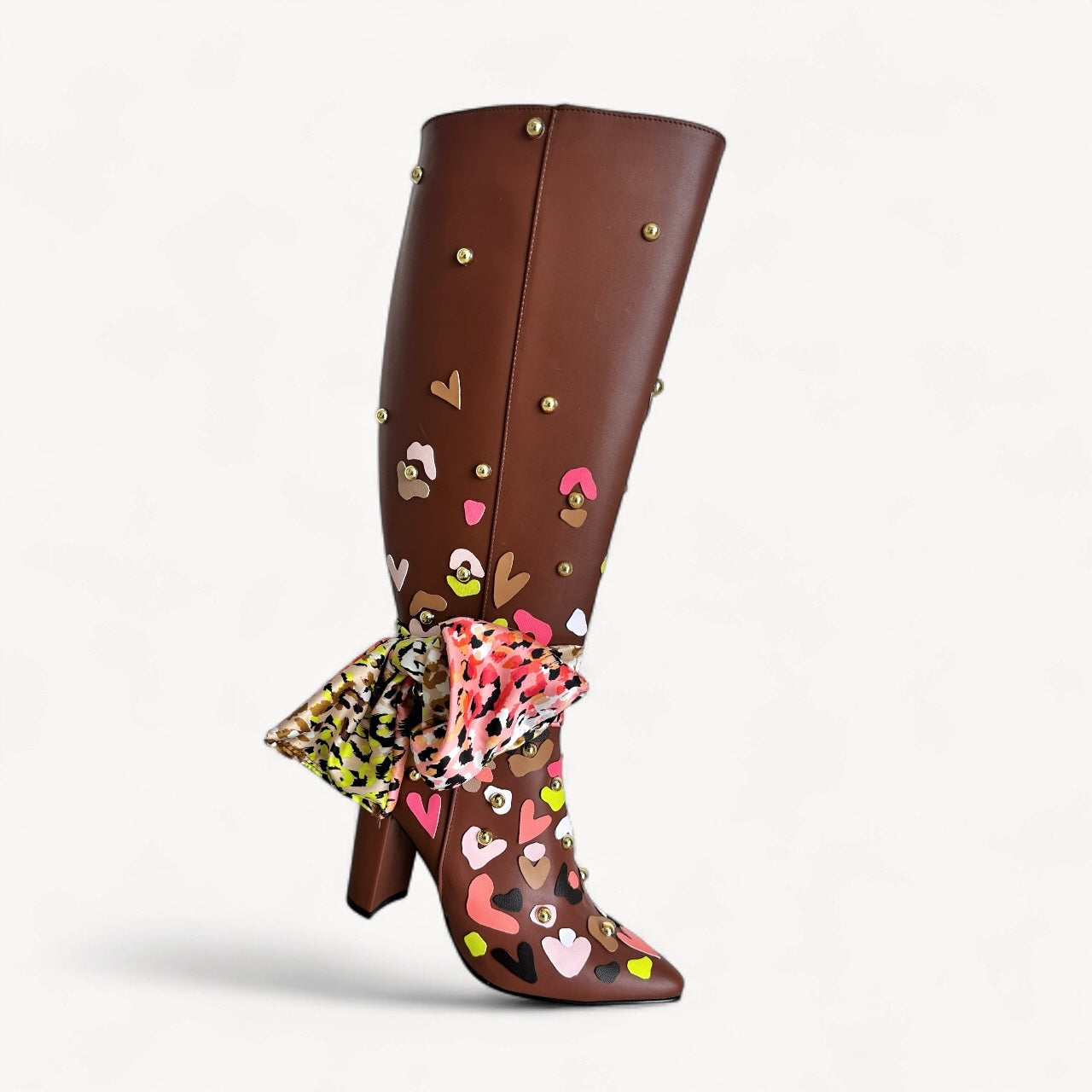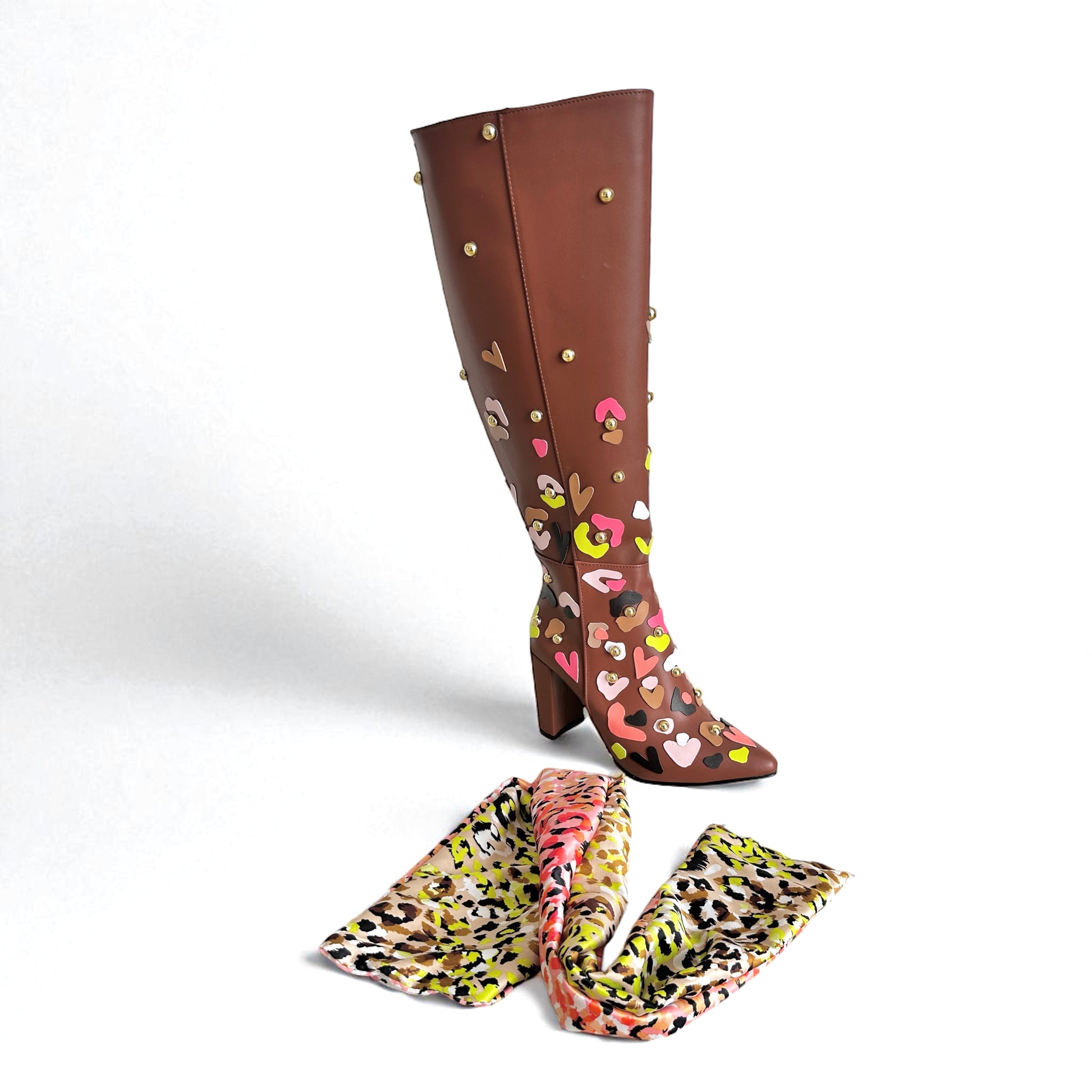 BOTA COLOR TAN CON APLICACIONES QUE SIMULAN ANIMAL PRINT MULTICOLOR. TIENE DETALLE DE MASCADA QUE SE PUEDE QUITAR Y PONER, CIERRE INTERNO Y TACÓN ALTURA 8 CM.