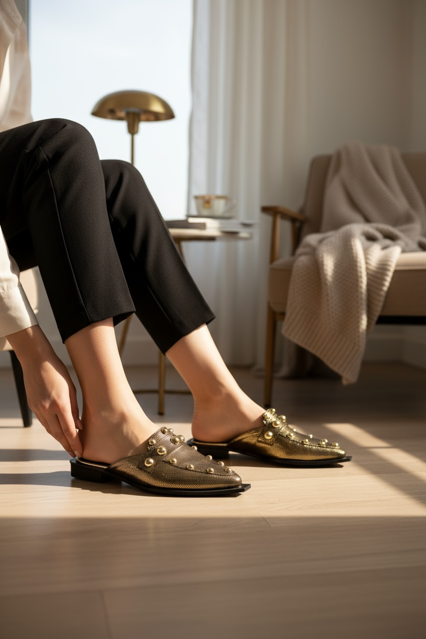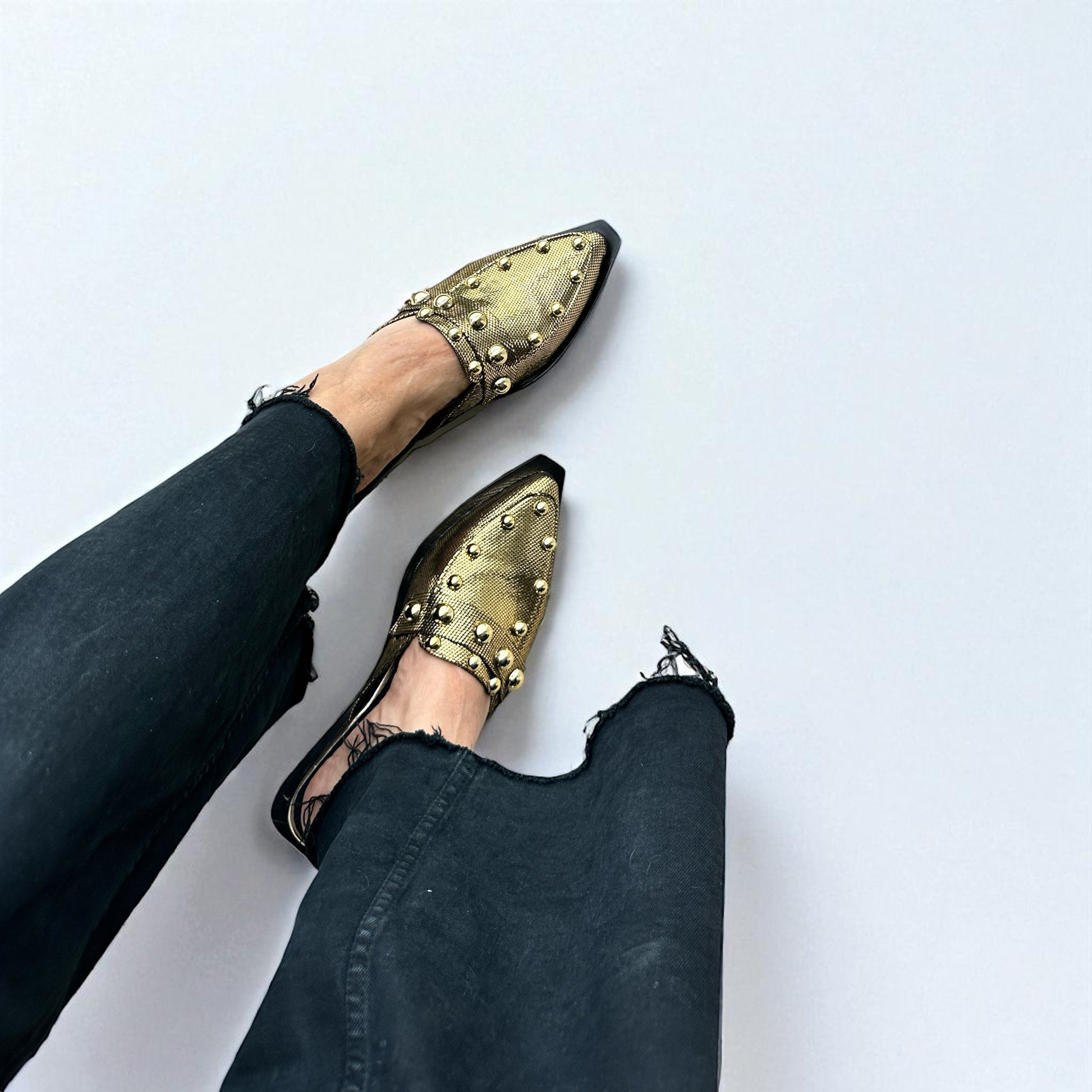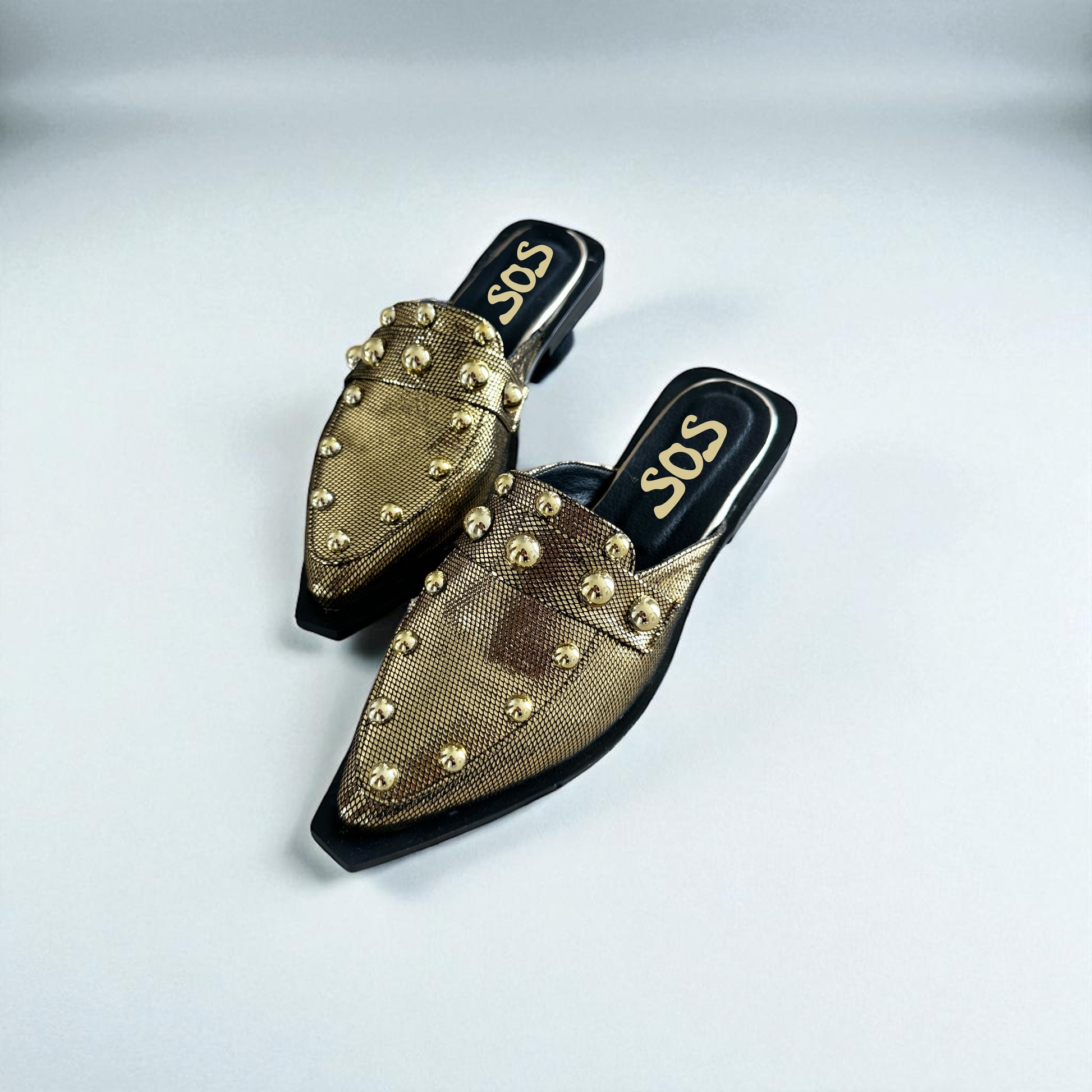 MULES EN CORTE DE PIEL GENUINA CON FOLIA DORADA Y APLICACIONES DE PERLAS SINTETICAS ORO, SUELA SINTETICA Y FORRO SINTETICO